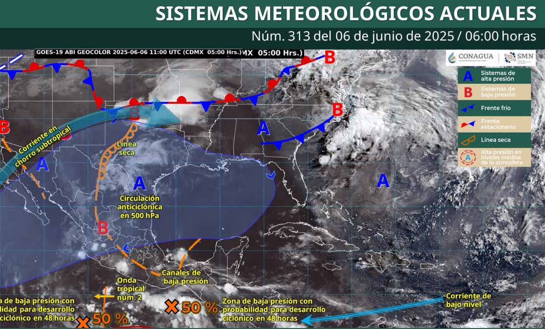 Pronóstico del clima en Quintana Roo para hoy viernes 6 de junio 2025.- Para este día, una línea seca sobre el norte del país continuará interactuando con inestabilidad atmosférica y con la corriente en chorro subtropical, por lo que se prevén lluvias puntuales fuertes con posible caída de granizo en Chihuahua y Durango.
