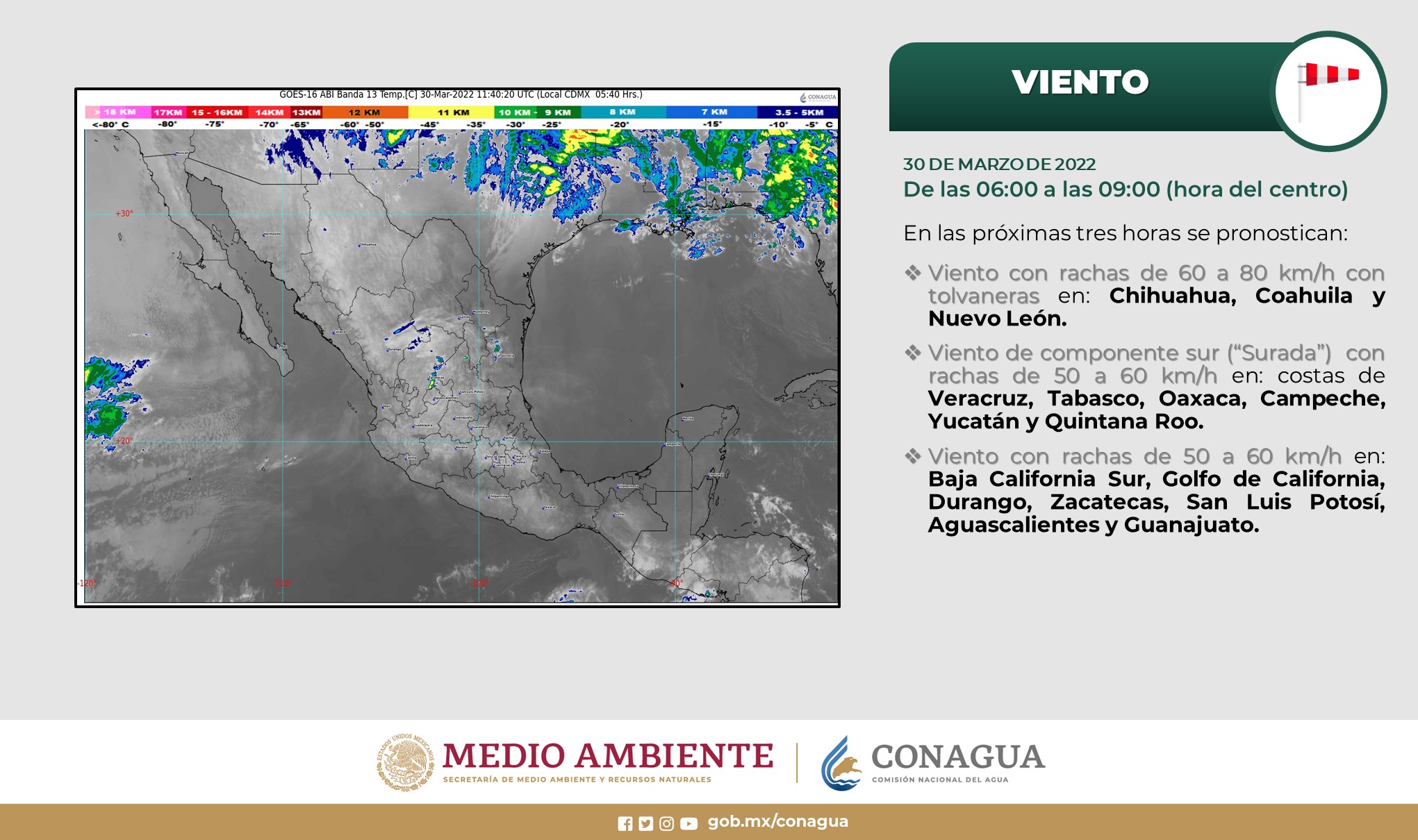Viento de componente sur (“Surada”) con rachas de 50 a 60 km/h: Veracruz, Tabasco, Oaxaca, Chiapas, Campeche, Yucatán y Quintana Roo.
