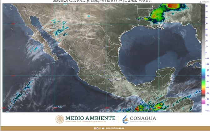 Por otra parte, un canal de baja presión sobre estados de la Mesa del Norte y Mesa Central, y otro sobre el sureste del país, asociados con la entrada de humedad de ambos océanos y con inestabilidad en niveles altos de la atmósfera, originarán condiciones para lluvias puntuales fuertes, descargas eléctricas y posible caída de granizo en zonas de Puebla, Veracruz, Oaxaca y Chiapas, así como lluvias con intervalos de chubascos en el centro del país, incluido el Valle de México, y sobre la Península de Yucatán.