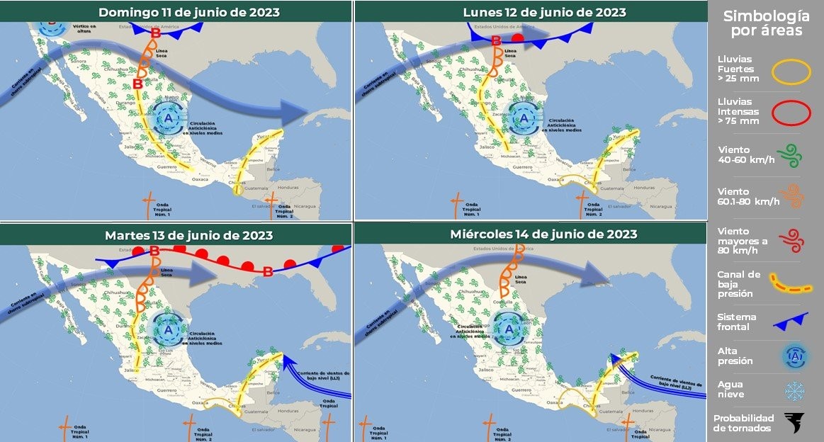 Mientras que la onda tropical Núm. 2 que cruzará el sureste del país y canal de baja presión sobre la Península de Yucatán, ocasionarán lluvias puntuales muy fuertes en Chiapas, fuertes en Oaxaca y chubascos en la Península de Yucatán.