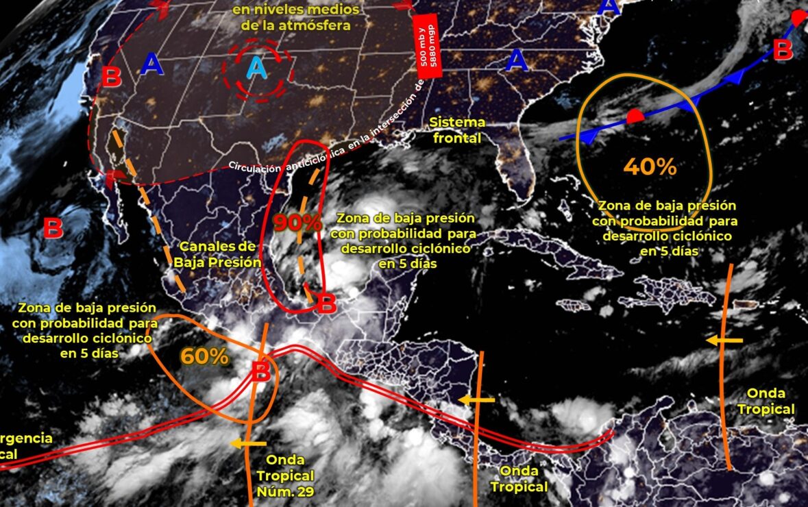 Para más información de la zona de baja presión con probabilidad de desarrollo ciclónico en el Océano Pacífico, así como de las zonas de baja presión con potencial ciclónico en el Océano Atlántico, consultar los avisos del Servicio Meteorológico Nacional a través de: