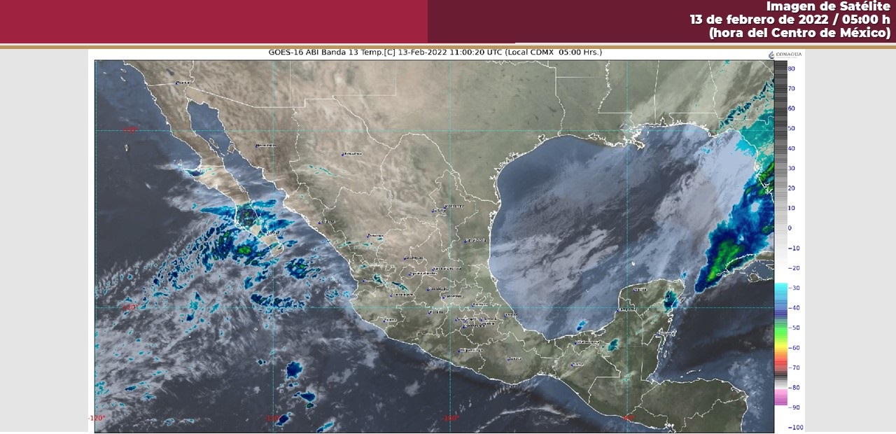 Golfo de México: Cielo nublado la mayor parte del día, con lluvias puntuales intensas en Veracruz y Tabasco y sin lluvias en Tamaulipas. Marcado descenso de la temperatura. Densas nieblas y probable caída de aguanieve o nieve por arriba de los 4000 msnm de Veracruz. Evento de «Norte» con rachas de 80 a 100 km/h en las costas de Veracruz (centro y sur) y Tabasco y rachas de 60 a 80 km/h en costas de Tamaulipas. Oleaje de 3 a 5 metros de altura en costas de Veracruz y Tabasco y de 1 a 3 metros de altura en costas de Tamaulipas.
