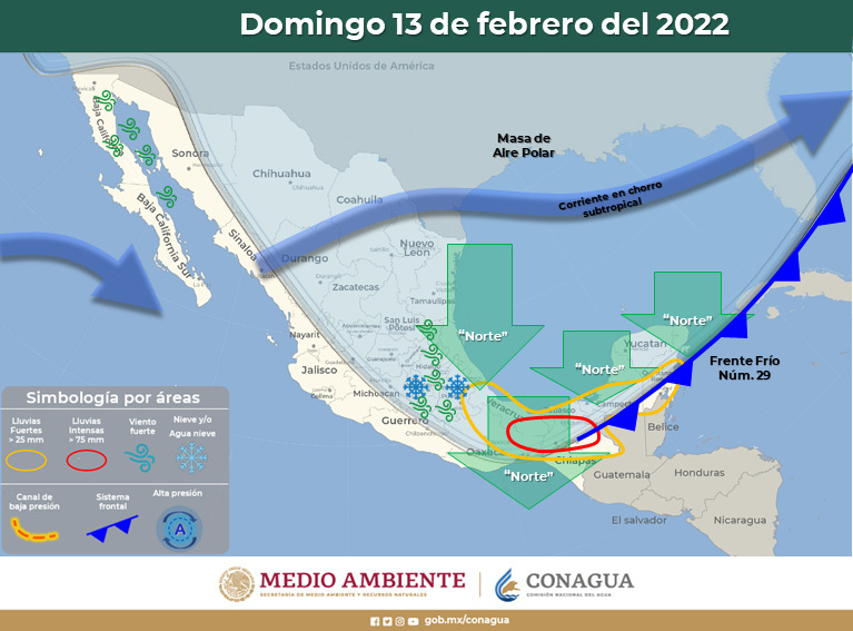Golfo de México: Cielo nublado la mayor parte del día, con lluvias puntuales intensas en Veracruz y Tabasco y sin lluvias en Tamaulipas. Marcado descenso de la temperatura. Densas nieblas y probable caída de aguanieve o nieve por arriba de los 4000 msnm de Veracruz. Evento de «Norte» con rachas de 80 a 100 km/h en las costas de Veracruz (centro y sur) y Tabasco y rachas de 60 a 80 km/h en costas de Tamaulipas. Oleaje de 3 a 5 metros de altura en costas de Veracruz y Tabasco y de 1 a 3 metros de altura en costas de Tamaulipas.