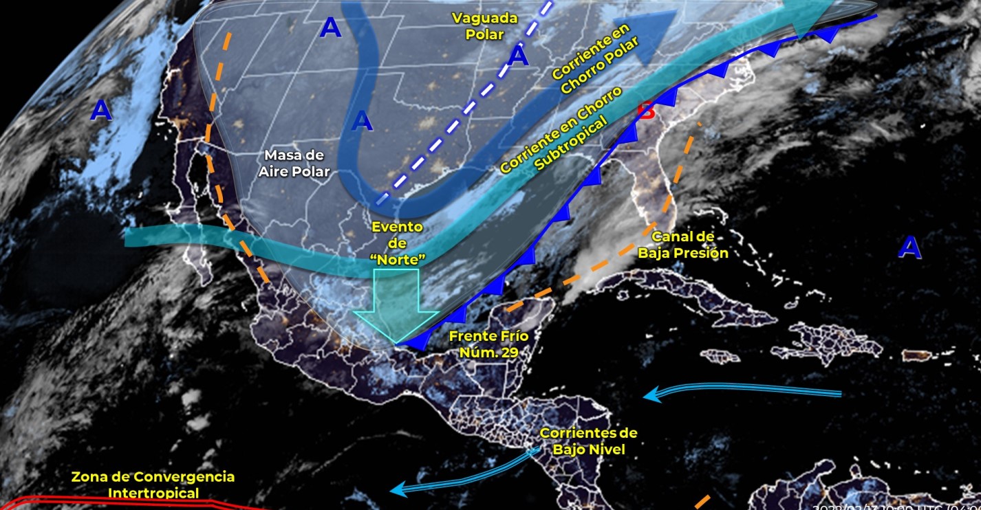 La masa de aire polar asociada al frente ocasionará marcado descenso de temperatura en gran parte del país, heladas matutinas sobre entidades de la Mesa del Norte y la Mesa Central, bancos de niebla en el noreste y oriente del territorio nacional, así como evento de “Norte” de 100 a 120 km/h en el Istmo y Golfo de Tehuantepec, rachas de 80 a 100 km/h en costas de Veracruz y Tabasco, de 80 km/h en costas de Tamaulipas y de 60 km/h en las costas de la Península de Yucatán.