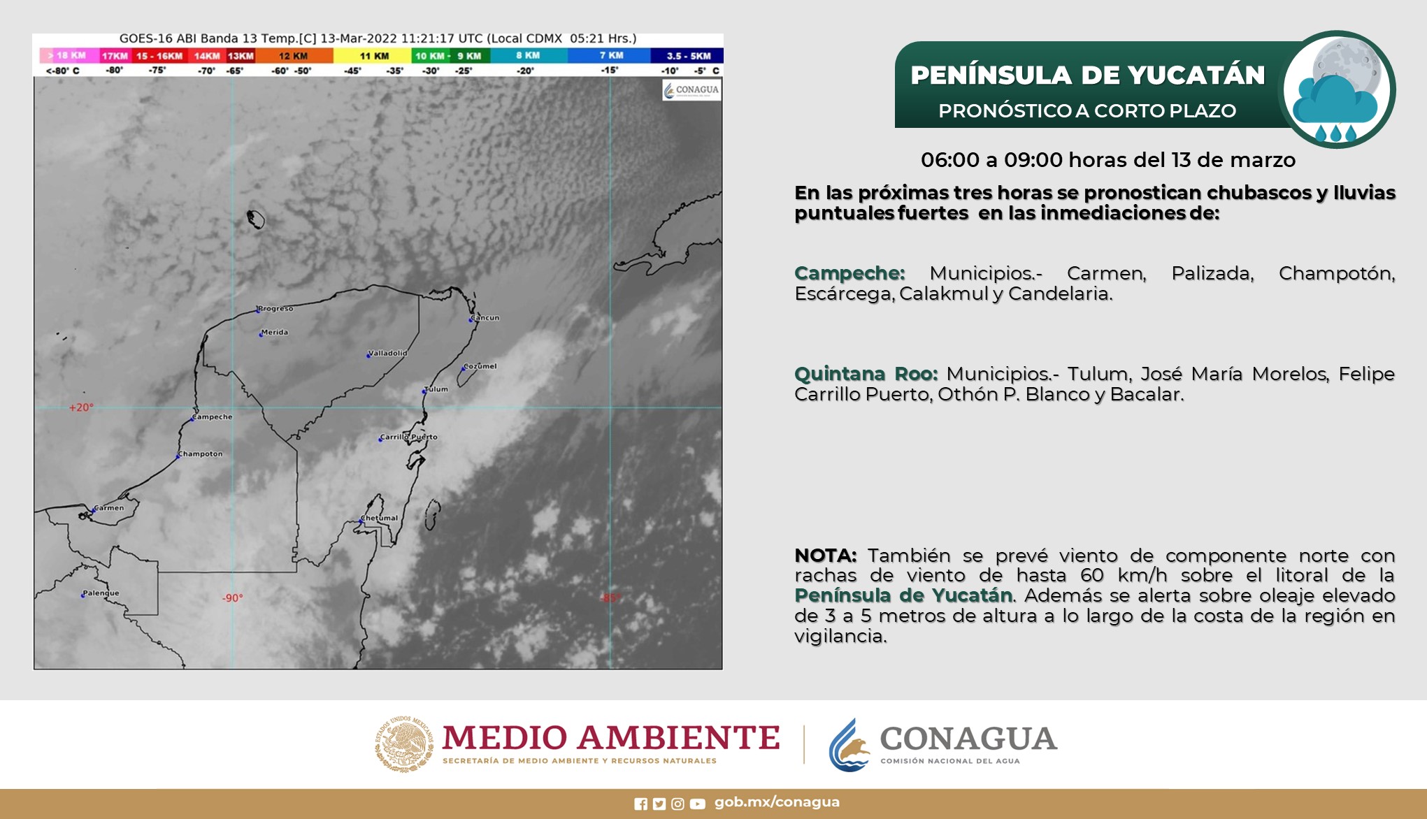 Península de Yucatán: Cielo nublado durante el día con probabilidad de lluvias puntuales fuertes en Campeche, chubascos en Quintana Roo y lluvias aisladas en Yucatán. Ambiente matutino fresco y cálido por la tarde. Por la mañana, evento de «Norte» con rachas de 40 a 50 km/h con olas de 1 a 3 metros de altura en costas de Campeche, Yucatán y Quintana Roo.