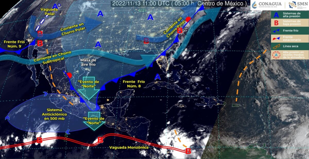 La masa de aire frío asociada al sistema mantendrá evento de “Norte” muy fuerte en el Istmo de Tehuantepec, con oleaje de 1 a 3 metros en el Golfo de Tehuantepec, y fuerte con oleaje de 1 a 2 metros de altura en el litoral de Tamaulipas y Veracruz, condiciones que disminuirán al final del día.