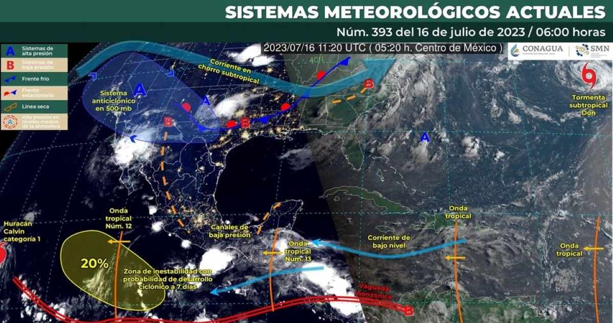 Un segundo canal de baja presión se extenderá sobre el occidente y centro del territorio nacional, asociado con el ingreso de humedad proveniente de ambos océanos, propiciará lluvias y chubascos en las regiones mencionadas, con lluvias puntuales fuertes en Jalisco, Colima, Michoacán y Guerrero.