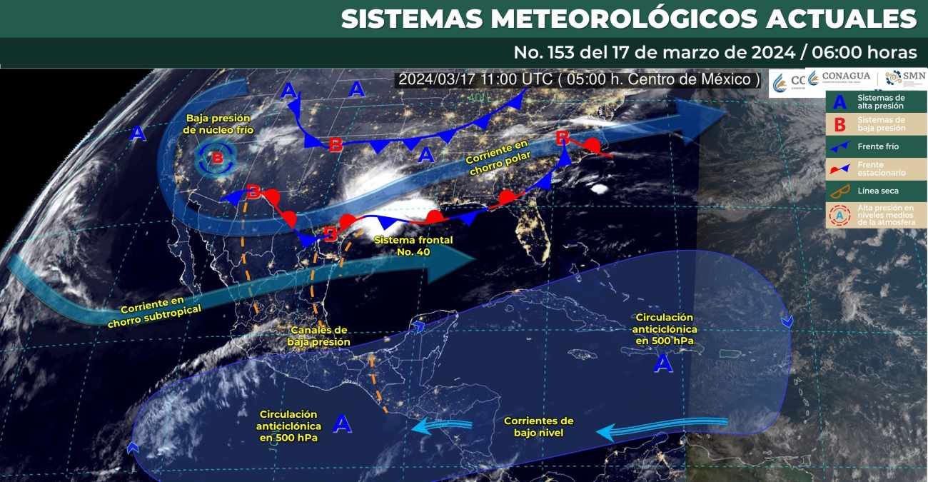 A su vez, un canal de baja presión en el sureste mexicano, en interacción con el ingreso de humedad del Golfo de México y el Océano Pacífico, generarán lluvias e intervalos de chubascos en estados del centro y sureste del país. Finalmente, prevalecerá ambiente caluroso a muy caluroso en gran parte del territorio nacional, con temperaturas máximas que podrían superar los 40 °C en zonas del occidente, sur, sureste y Península de Yucatán.