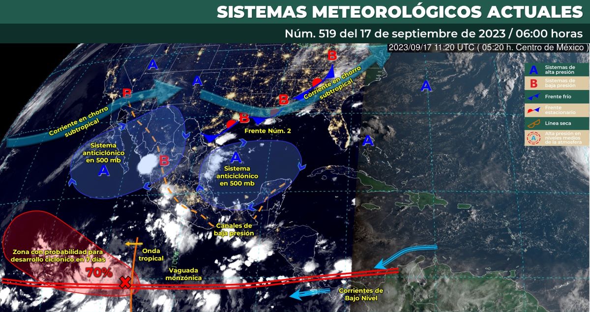 Pronóstico del clima para hoy domingo 17 de septiembre 2023 en Quintana Roo. Para este día, el frente número 2 se extenderá desde el norte del Golfo de México hasta el norte de Tamaulipas, lo que producirá lluvias puntuales muy fuertes en Tamaulipas y Nuevo León, y puntuales fuertes en Coahuila, todas con posibles granizadas.
