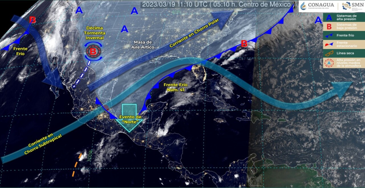 Golfo de México: Cielo nublado con lluvias puntuales torrenciales en Veracruz y Tabasco, así como chubascos en Tamaulipas, mismas que podrían generar incremento en los niveles de ríos y arroyos, deslaves e inundaciones. Nieblas al amanecer en zonas serranas. Ambiente fresco por la mañana, así como templado en Tabasco y en costas del sur de Veracruz; siendo frío con posibles heladas en sierras de Tamaulipas y muy frío con heladas en zonas altas de Veracruz. Por la tarde, ambiente fresco en Tamaulipas y cálido en Veracruz y Tabasco. Posible caída de nieve o aguanieve en el noroeste de Tamaulipas. Evento de “Norte” con rachas de 90 a 110 km/h y oleaje de 3 a 5 metros de altura en el litoral de Tamaulipas y Veracruz, y con rachas de 50 a 70 km/h acompañadas de oleaje de 1 a 2 metros de altura en costas de Tabasco.