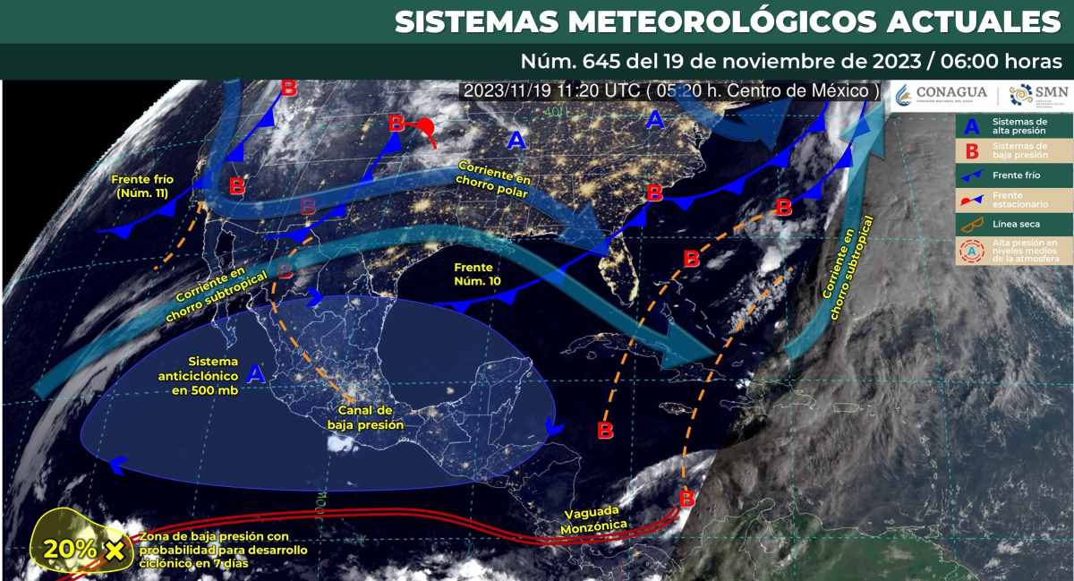 Asimismo, un nuevo frente frío (11) se desplazará sobre el noroeste y norte del territorio nacional, interaccionando con una línea seca que se establecerá en Coahuila y con las corrientes en chorro polar y subtropical, originando fuertes rachas de viento en las regiones mencionadas y probabilidad para la formación de torbellinos en Chihuahua, Coahuila y Nuevo León.