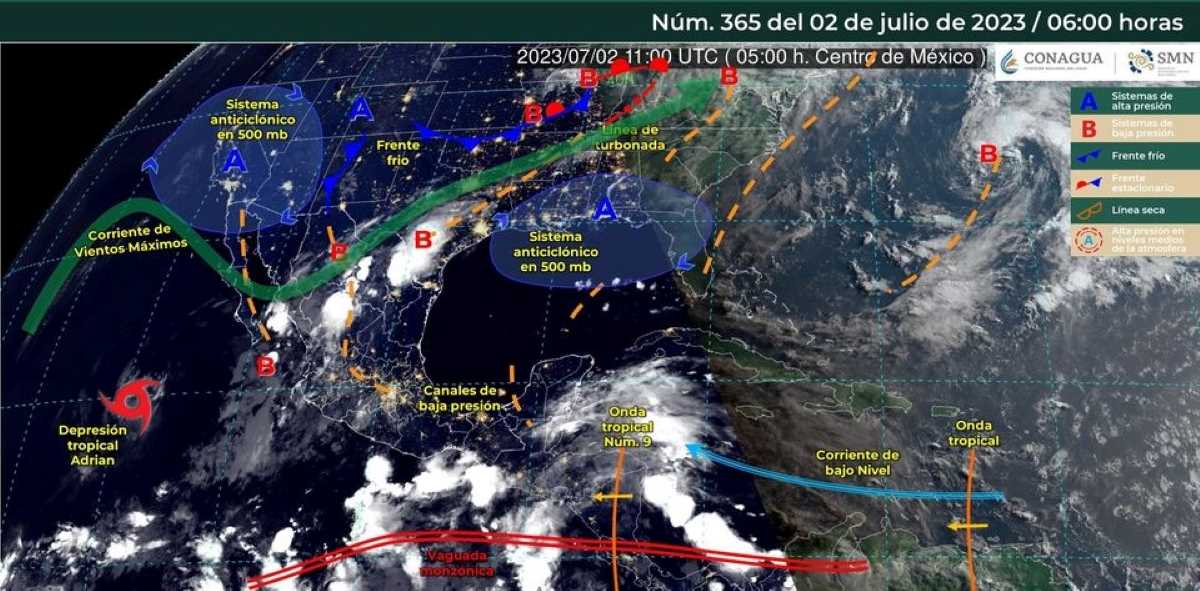 Por otra parte, un canal de baja presión que se extiende desde el centro hasta el sureste del territorio nacional; una nueva onda tropical número 9 que recorrerá el sur de la Península de Yucatán y el ingreso de humedad del Golfo de México y Mar Caribe, ocasionarán lluvias puntuales intensas en Chiapas, Campeche y Yucatán, además de lluvias fuertes a muy fuertes en las regiones antes mencionadas, incluido el Valle de México.