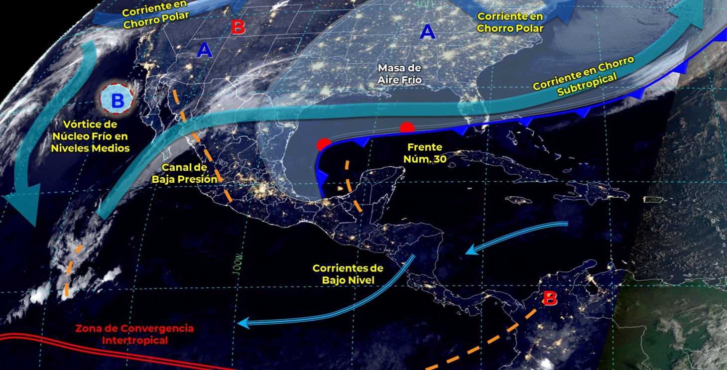 La masa de aire frío asociada al frente comenzará a modificar sus características térmicas, previéndose un aumento de las temperaturas durante la tarde, sin embargo, continuará el ambiente frío a muy frío con heladas al amanecer en zonas altas del noroeste, norte, occidente, centro y oriente del país. Asimismo, mantendrá viento de componente norte en Veracruz, Istmo y Golfo de Tehuantepec.