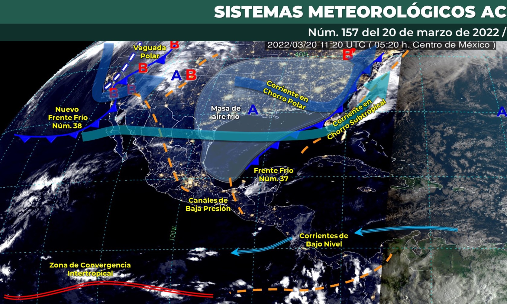 Pronóstico del clima para hoy domingo 20 de marzo en Quintana Roo. Durante este día, el nuevo frente frío número 38 recorrerá el noroeste de México, en interacción con una vaguada polar y la corriente en chorro subtropical que cruzan dicha región, además de una línea seca que se establecerá sobre el norte del país, generarán lluvias con chubascos en Baja California, Sonora y Chihuahua.