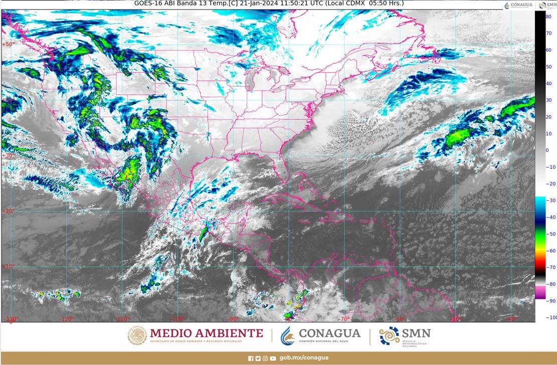 Asimismo, continuarán las condiciones para la caída de nieve, aguanieve o lluvia engelante en sierras de Baja California, Sonora, Chihuahua, Durango y Sinaloa, así como en las cimas montañosas superiores a los 4,200 msnm del centro y oriente de la República Mexicana.
