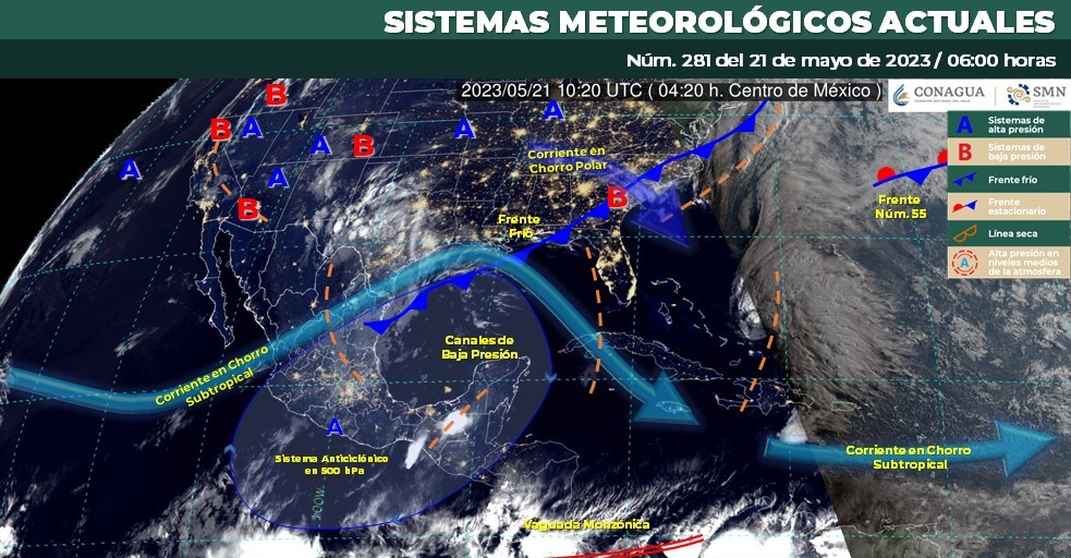 Pronóstico del clima para hoy domingo 21 de mayo 2023 en Quintana Roo. Este día, el frente frío (fuera de temporada) se localizará sobre el noreste y oriente de la República Mexicana, interaccionará con un canal de baja presión sobre el centro y oriente del territorio nacional, con la corriente en chorro subtropical y con inestabilidad en niveles altos de la atmósfera, originando lluvias puntuales fuertes en Coahuila, Nuevo León, Tamaulipas, Puebla y Veracruz.}