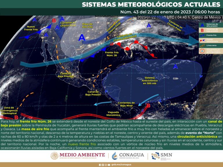 Pronóstico del clima para hoy domingo 22 de enero en Quintana Roo. Para este día, el frente frío número 26 se extenderá desde el noreste del Golfo de México hasta el sureste del país, en interacción con un canal de baja presión sobre la Península de Yucatán, generará lluvias fuertes que podrían acompañarse de descargas eléctricas en Puebla, Veracruz y Oaxaca.
