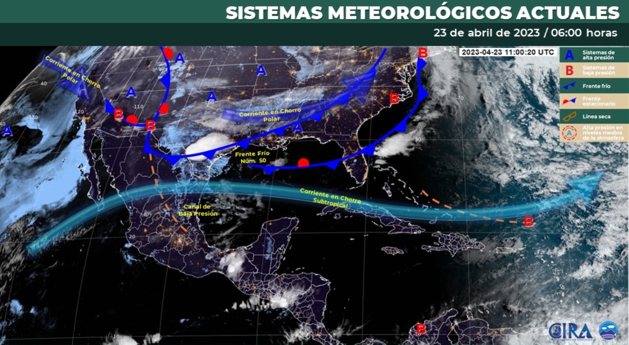Pronóstico del clima para hoy domingo 23 de abril 2023 en Quintana Roo. Este día, el frente frío número 50, reforzado por una nueva masa de aire frío, se extenderá desde el norte y noreste de la República Mexicana hasta el centro del Golfo de México.