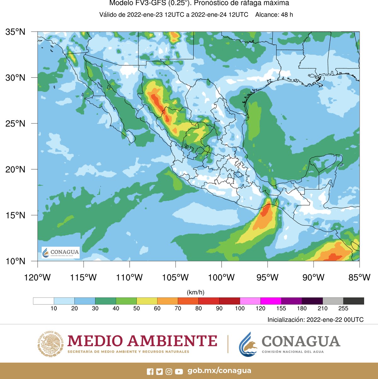 Evento de «Norte» con rachas de viento de 70 a 80 km/h: Istmo y Golfo de Tehuantepec, y con rachas de 50 a 60 km/h: costas de Veracruz, Tabasco, Campeche, Yucatán y Quintana Roo (norte).