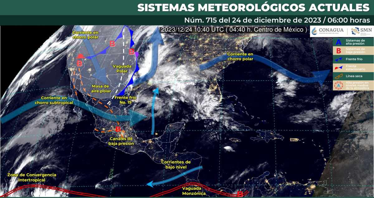Valle de México: Durante la mañana, se prevé cielo despejado, ambiente frío a muy frío con posibles heladas en partes altas de la región y bancos de niebla en zonas altas del valle de México, mismos que podrían reducir la visibilidad. Por la tarde, se prevé cielo medio nublado a nublado, bruma, ambiente templado y probabilidad de lluvias aisladas en la Ciudad de México e intervalos de chubascos en el Estado de México. Viento de dirección variable de 10 a 25 km/h con rachas de hasta 50 km/h. Para la Ciudad de México, se pronostica una temperatura mínima de 4 a 6 °C y la máxima de 22 a 24 °C. Para Toluca, Edo. Méx., la temperatura mínima será de 1 a 3 °C y la máxima de 19 a 21 °C.
