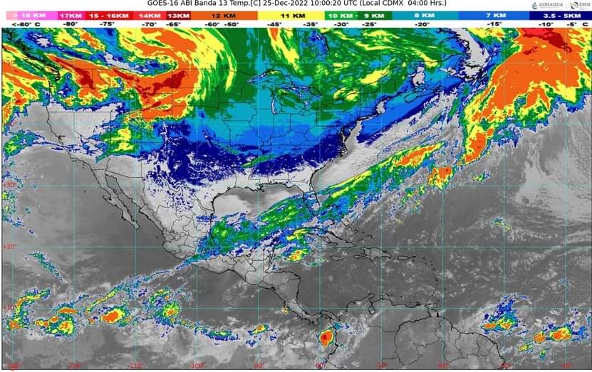 Golfo de México: Cielo nublado durante el día. Continuarán lluvias puntuales intensas en Veracruz y Tabasco, además de lluvias aisladas en Tamaulipas. Ambiente muy frío con heladas al amanecer en zonas altas de Tamaulipas y Veracruz y fresco en Tabasco. Por la tarde, ambiente fresco en la región y templado en costas de Tabasco. Además, bancos de niebla en sierras de la región. Evento de “Norte” intenso con rachas de 80 a 100 km/h y oleaje de 3 a 5 metros de altura en costas de Veracruz y muy fuerte con rachas de 60 a 80 km/h en Tamaulipas y Tabasco, también oleaje de 2 a 4 metros de altura en las costas de dichos estados. Asimismo, existirán condiciones para la caída de aguanieve o nieve en sierras de Veracruz.