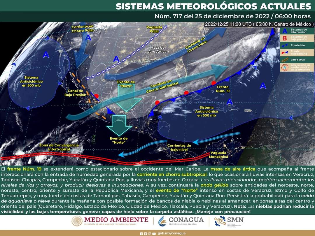 La masa de aire ártica que acompaña al frente interaccionará con la entrada de humedad generada por la corriente en chorro subtropical, lo que ocasionará probabilidad para lluvias intensas en Veracruz, Tabasco, Chiapas, Campeche, Yucatán y Quintana Roo.