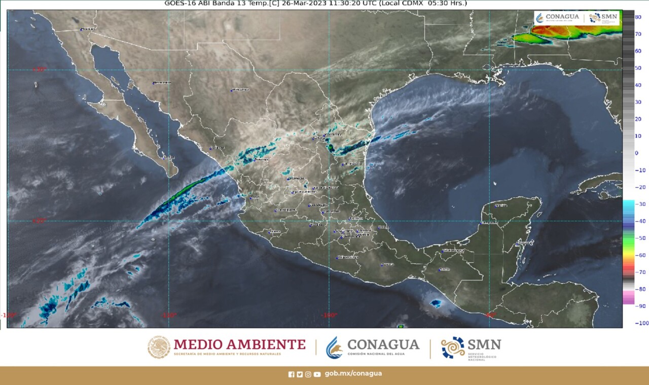Por su parte, la corriente en chorro subtropical, sobre el norte del territorio nacional, ocasionará vientos fuertes con probables tolvaneras en esa región. Así mismo, un canal de baja presión y la entrada de humedad proveniente de ambos océanos, generarán lluvias y chubascos, descargas eléctricas y posible caída de granizo en el oriente y sureste de México, con lluvias aisladas en el centro y valle de México.