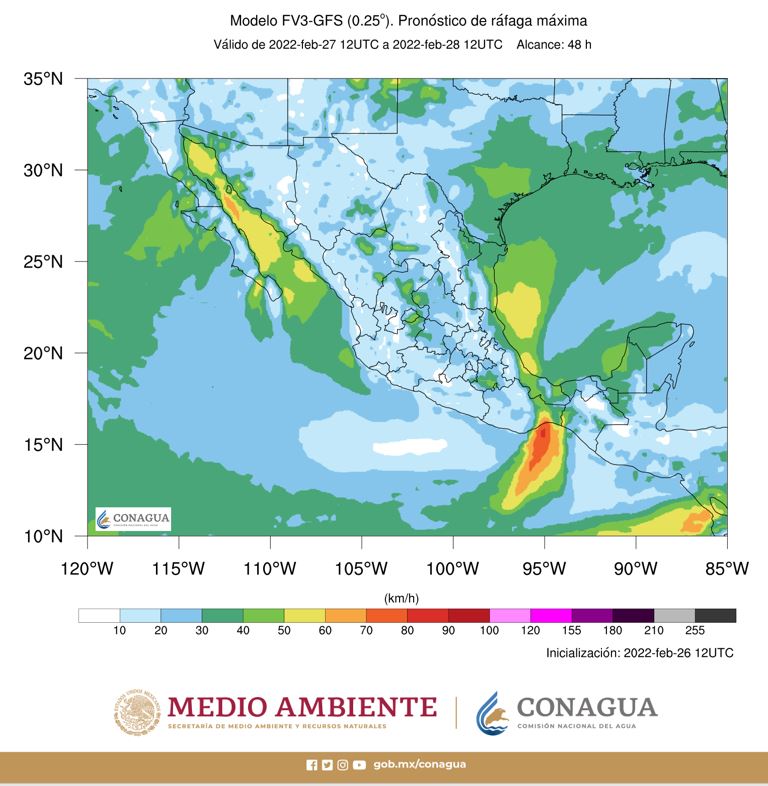 Evento de “Norte” con rachas de 70 a 90 km/h: Istmo y Golfo de Tehuantepec, así como rachas de 50 a 70 km/h en el litoral de Tamaulipas, Veracruz y Tabasco (occidente).