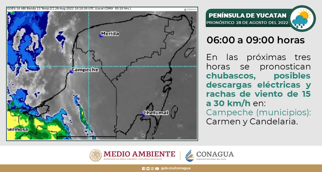 Península de Yucatán: Cielo parcialmente nublado y ambiente templado por la mañana. Por la tarde, cielo nublado con lluvias puntuales muy fuertes en Campeche y lluvias con intervalos de chubascos en Yucatán y Quintana Roo; todas con descargas eléctricas. Ambiente cálido a caluroso por la tarde y viento de componente este de 10 a 20 km/h en la región, con rachas de 40 a 50 km/h en Campeche y Yucatán.