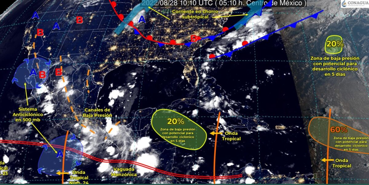 Un segundo canal de baja presión que se ubicará en el oriente y sureste de México, en combinación con la entrada de humedad del Golfo de México y mar Caribe, producirán chubascos en Quintana Roo, Yucatán y Tamaulipas; lluvias puntuales muy fuertes en Campeche, e intensas en Veracruz, Oaxaca y Chiapas.