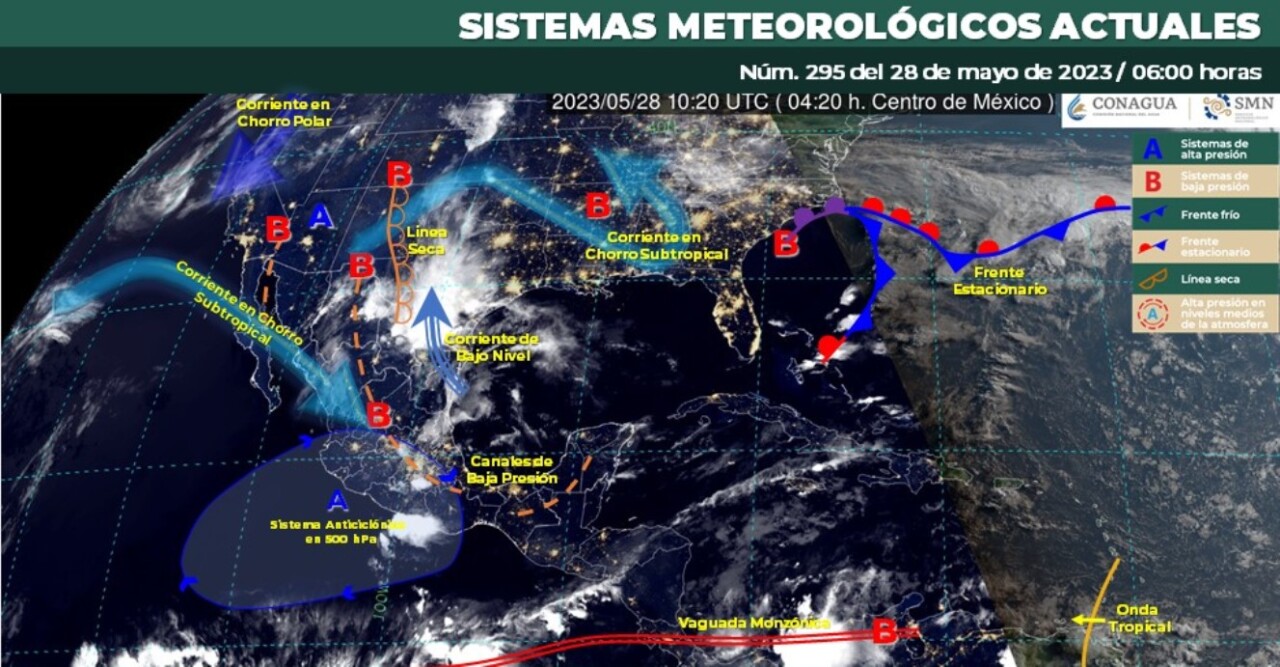 Pronóstico del clima para hoy domingo 28 de mayo 2023 en Quintana Roo. Para este día, una línea seca en el norte del territorio nacional, interaccionará con un canal de baja presión que se extenderá desde la Mesa del Norte hasta el sur país, y con una amplia área de inestabilidad en la atmósfera superior, propiciarán lluvias puntuales intensas con granizadas y posibles torbellinos o tornados.