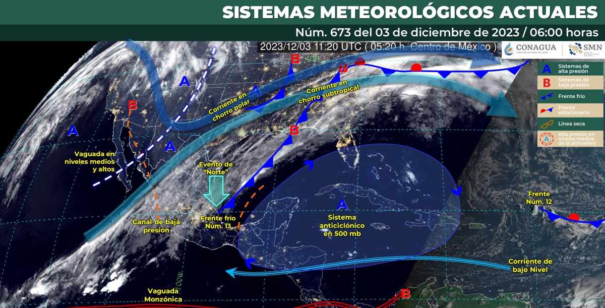 Pronóstico del clima para hoy domingo 3 de diciembre 2023 en Quintana Roo. Este día, el frente frío número 13 se extenderá como estacionario sobre el sureste de la República Mexicana, la Sonda de Campeche y el centro del país, continuará interactuando con el ingreso de humedad generado por la corriente en chorro subtropical, produciendo lluvias intensas a puntuales torrenciales en Veracruz, Chiapas y Tabasco; lluvias muy fuertes a puntuales intensas en Puebla, Oaxaca, Campeche y Yucatán; así como chubascos y lluvias fuertes sobre entidades del noreste, centro y oriente del territorio nacional.
