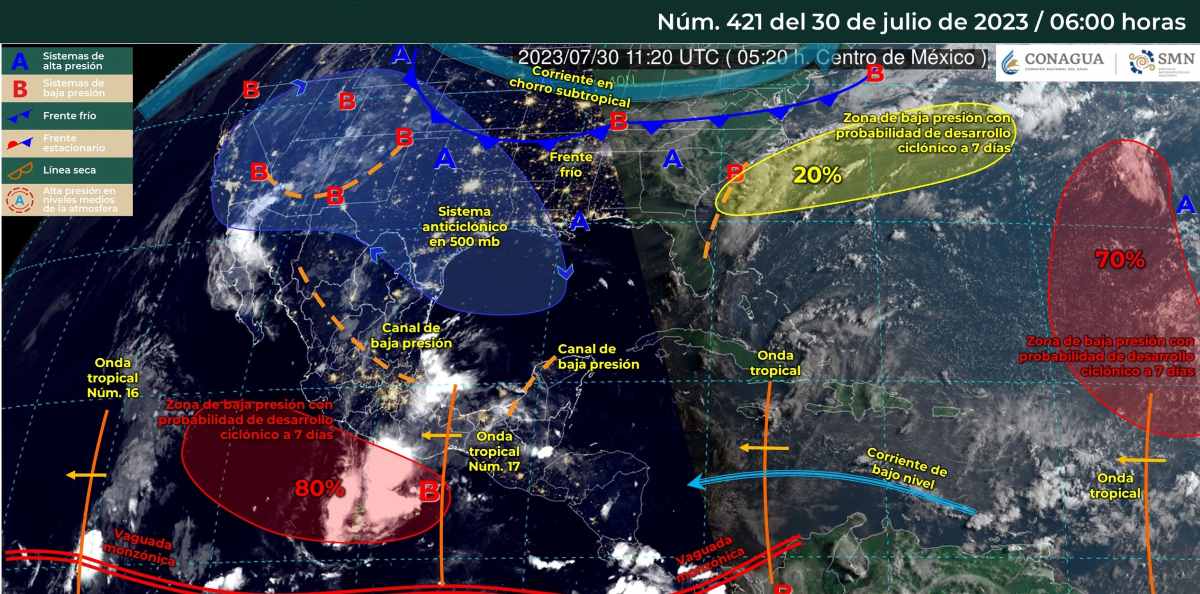 Pacífico Sur: Cielo medio nublado en la mañana con bancos de niebla en zonas altas de Oaxaca y Chiapas. Por la tarde, cielo nublado con lluvias puntuales intensas, descargas eléctricas y posible caída de granizo en Guerrero, Oaxaca y Chiapas, mismas que podrían ocasionar encharcamientos, incrementar los niveles de ríos y arroyos, así como generar deslaves e inundaciones. Ambiente fresco por la mañana y cálido a caluroso por la tarde.