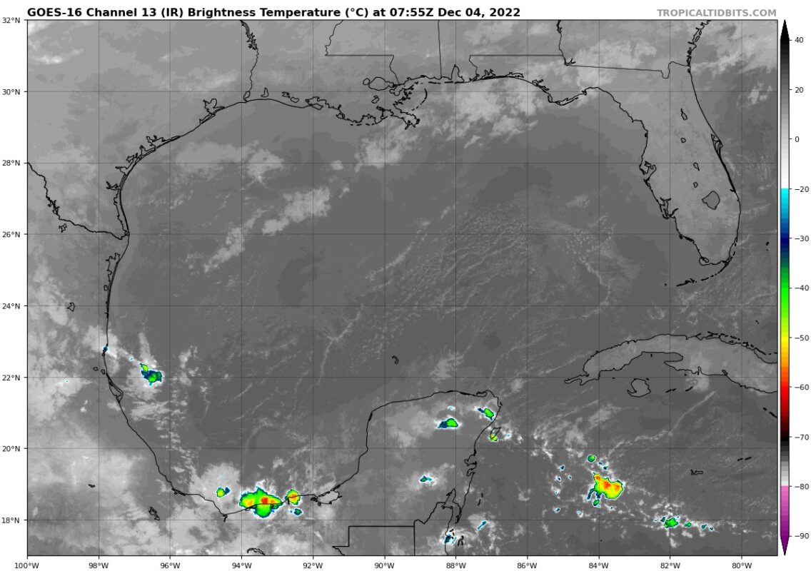 Golfo de México: Cielo medio nublado a nublado durante el día, con bancos de niebla matutinos en zonas serranas. Lluvias puntuales muy fuertes en Veracruz, fuertes en Tabasco y chubascos en Tamaulipas, todas con descargas eléctricas, las cuales podrían generar incremento en los niveles de ríos y arroyos, deslaves e inundaciones en zonas bajas del sur de Veracruz. Ambiente matutino fresco a templado en zonas serranas y cálido por la tarde en costas. Viento de dirección variable de 15 a 30 km/h principalmente en zonas costeras.