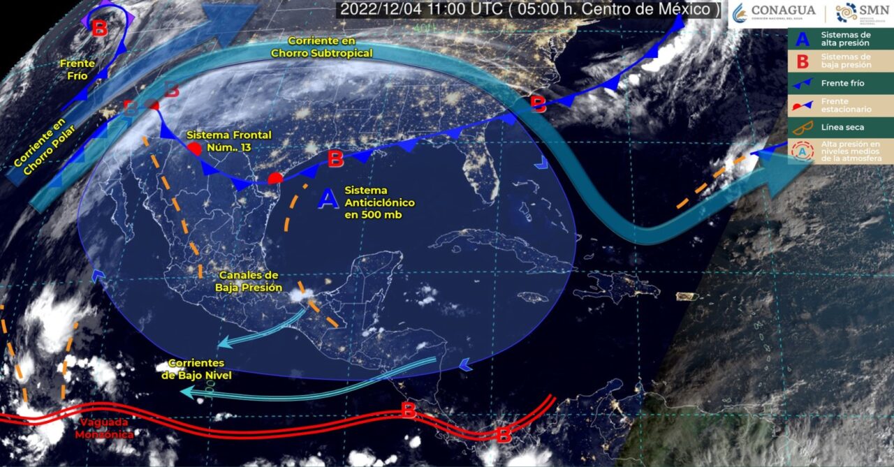 La masa de aire frío asociada a dicho sistema frontal, propiciará ambiente matutino frío a muy frío con heladas sobre la Mesa del Norte y Mesa Central. Por su parte, el arrastre de humedad ocasionado por la corriente en chorro subtropical producirá lluvias y chubascos en la Península de Baja California, Sonora, Chihuahua y Durango.