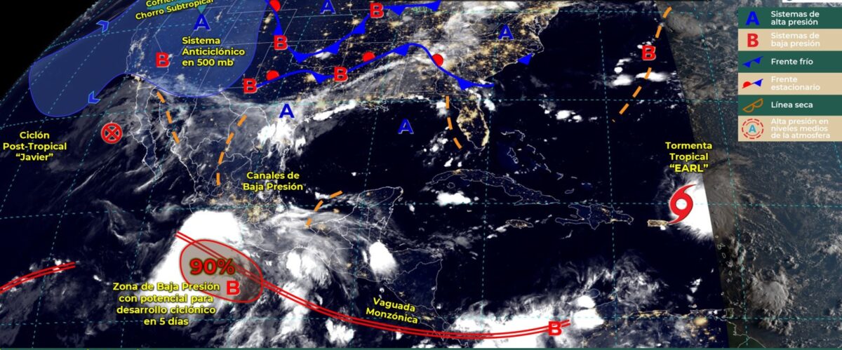 Canales de baja presión prevalecerán sobre el noreste, oriente y sureste de la República Mexicana y la Península de Yucatán en interacción con el ingreso de humedad proveniente del Océano Pacífico y Mar Caribe, lo cual ocasionará lluvias puntuales intensas en zonas de Coahuila, Nuevo León, Hidalgo, Puebla y Veracruz; lluvias puntuales muy fuertes en Tamaulipas, San Luis Potosí y Chiapas; lluvias puntuales fuertes en Tabasco y Campeche, así como chubascos en Yucatán y Quintana Roo.
