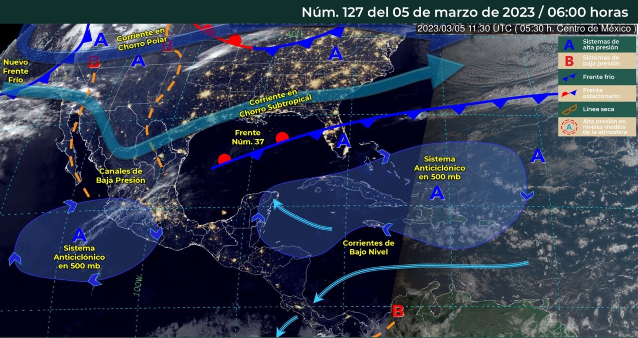 Pronóstico del clima para hoy domingo 5 de marzo 2023 en Quintana Roo. Para este día, el frente frío número 37 con características de estacionario sobre el noreste del Golfo de México, dejará de afectar al territorio nacional.