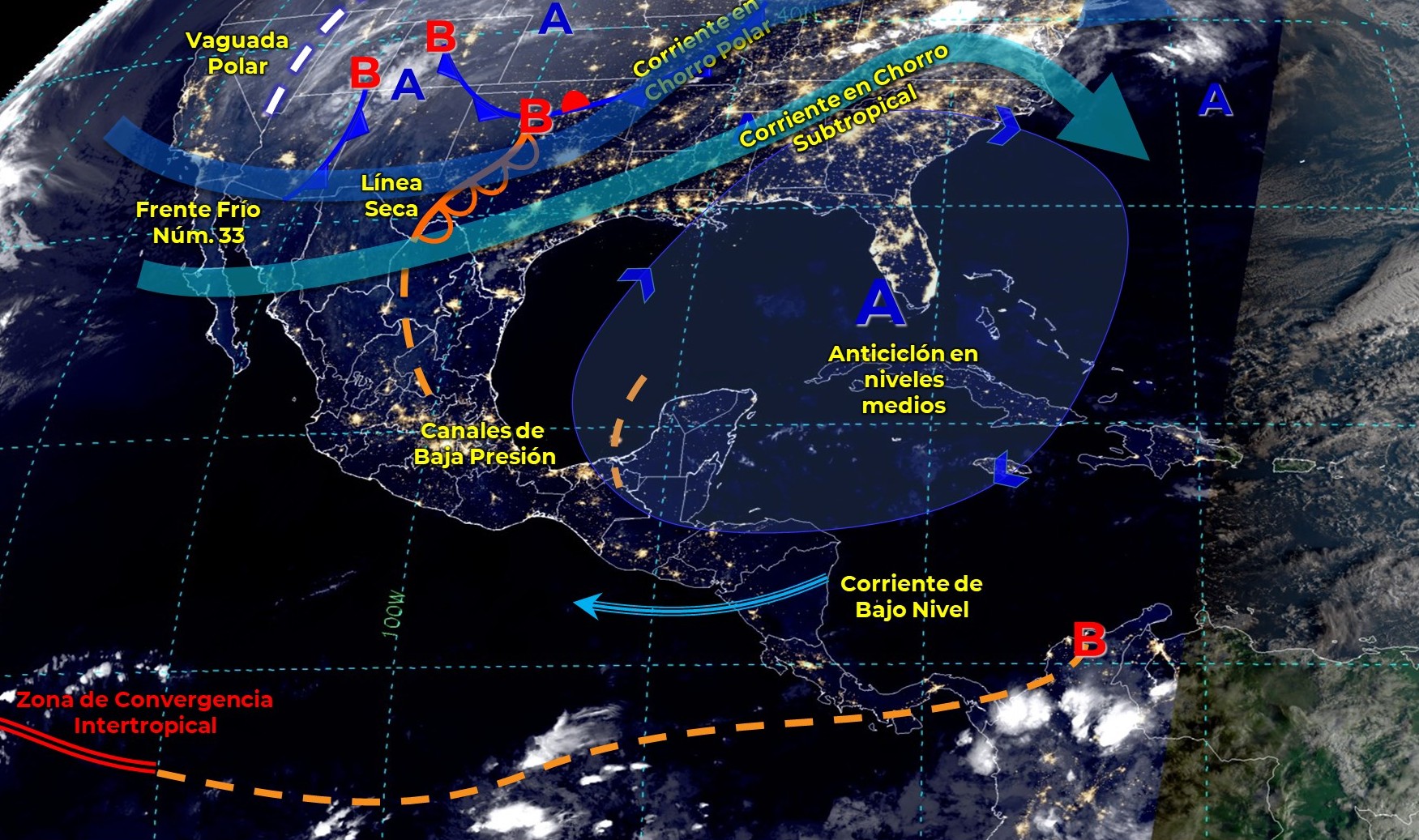 Pronóstico del clima para hoy domingo 6 de marzo en Quintana Roo. Durante este día, el frente frío número 33 recorrerá el noroeste y norte de México, asociado con una vaguada polar y con la corriente en chorro subtropical, en interacción con una línea seca sobre Coahuila, originarán descenso de temperatura y rachas muy fuertes de viento en dichas regiones.