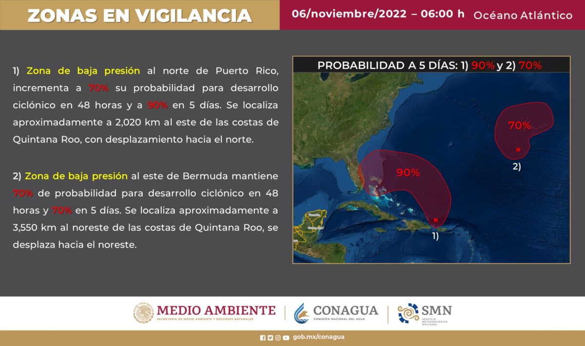 Por la tarde, este sistema adquirirá características cálidas y dejará de afectar al país. Un canal de baja presión se extenderá sobre el suroeste del Golfo de México y sureste mexicano, aunado al ingreso de humedad del mar Caribe, originará chubascos y lluvias fuertes en dichas regiones, además de la Península de Yucatán, con lluvias puntuales muy fuertes en Veracruz, Tabasco y Chiapas.