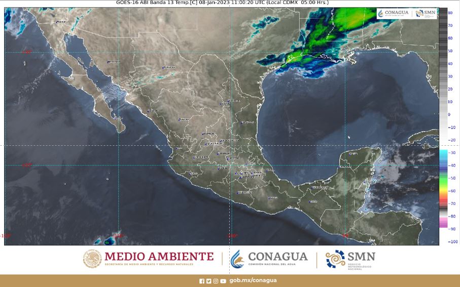 Golfo de México: Cielo medio nublado a nublado con lluvias e intervalos de chubascos en Tamaulipas, Veracruz y Tabasco. Por la mañana, ambiente fresco, y frío con posibles heladas y bancos de niebla en zonas altas de Veracruz. Por la tarde, ambiente templado a cálido. Viento de componente sur de 10 a 25 km/h en la región, y de componente norte con rachas de 40 a 50 km/h en Tamaulipas.