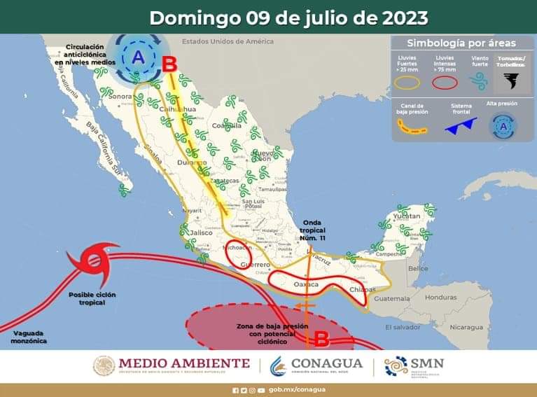 Pronóstico del clima para hoy domingo 9 de julio 2023 en Quintana Roo. Durante este día, la zona de baja presión con potencial para desarrollo ciclónico se localizará al sur de Baja California Sur, su amplia circulación ocasionará lluvias fuertes a muy fuertes acompañadas de descargas eléctricas en Baja California Sur y el occidente del país, además de rachas de viento de 50 a 70 km/h y oleaje de 2 a 4 metros de altura en las costas de Baja California Sur, Nayarit, Jalisco y Colima. El sistema mantendrá su desplazamiento hacia el oeste-noroeste, alejándose gradualmente de las costas nacionales.