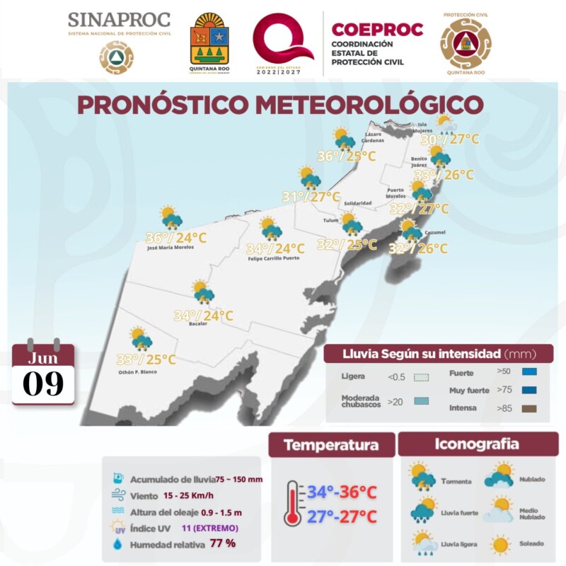 Pronóstico del clima para hoy domingo 9 de junio 2024 en Quintana Roo. Para este día, un centro de baja presión sobre la Península de Yucatán, se asociará con un canal de baja presión sobre el sureste de México y con el fuerte aporte de humedad proveniente de la vaguada monzónica que se extenderá muy próximo a las costas del Pacífico Sur Mexicano y con inestabilidad en niveles altos de la atmósfera, originarán lluvias muy fuertes en Tabasco y lluvias puntuales intensas en Oaxaca, Chiapas, Campeche, Yucatán y Quintana Roo, todas acompañadas de descargas eléctricas y posible caída de granizo.