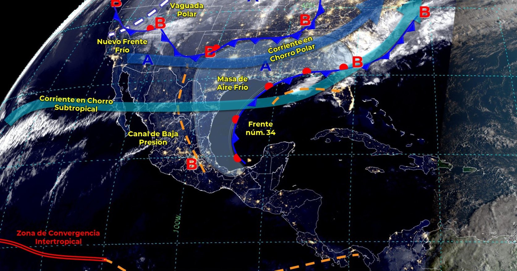 Pronóstico del clima para hoy jueves 10 de marzo en Quintana Roo. Este día, el frente frío 34 se extenderá sobre el Golfo de México, dejando de afectar gradualmente al país. La masa de aire frío que originó al frente mantendrá densos bancos de niebla en zonas de Nuevo León, Tamaulipas y Veracruz, además de ambiente muy frío con heladas al amanecer en sierras del noroeste, norte y centro de México; sin embargo, a lo largo del día modificará sus características térmicas permitiendo ascenso de las temperaturas. Por otra parte, un canal de baja presión originará lluvias con intervalos de chubascos en Chiapas y Tabasco. Por la noche, un nuevo frente frío, asociado con una vaguada polar, ingresará sobre el noroeste del territorio mexicano e interaccionará con la corriente en chorro subtropical, generando lluvias y chubascos en Baja California y Sonora; vientos fuertes en el noroeste y norte de país, así como condiciones para la caída de aguanieve o nieve en sierras de Baja California y Sonora. Finalmente, continuará el ambiente vespertino caluroso a muy caluroso en gran parte de la República Mexicana con temperaturas máximas de 40 a 45 °C en zonas de Michoacán, Guerrero, Campeche y Yucatán.