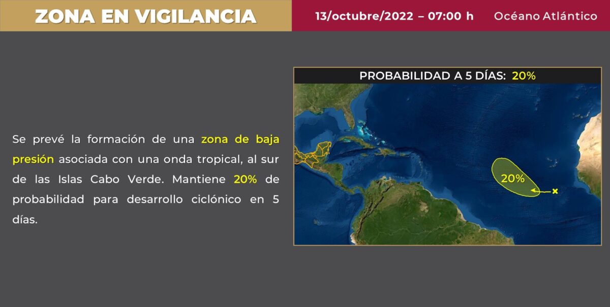 A su vez, se prevén rachas de viento de 70 a 90 km/h y oleaje de 2 a 3 metros de altura en las costas de Veracruz y Tabasco; así como rachas de viento de 40 a 60 km/h y oleaje de 1 a 2 metros de altura en las costas de Campeche y Yucatán.