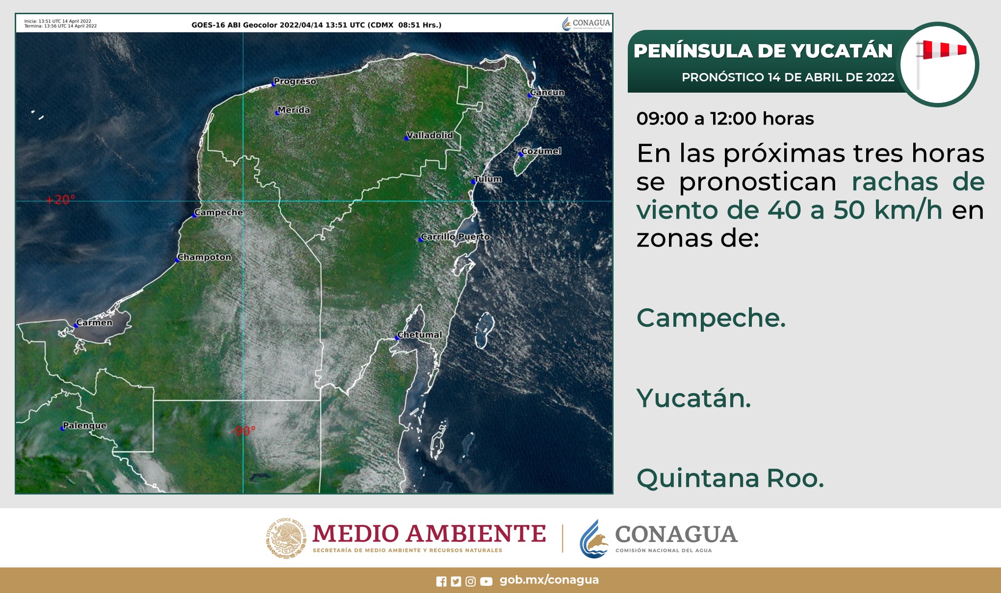 Viento con rachas de 50 a 60 km/h: Baja California, Chihuahua, Durango, Nuevo León, Tamaulipas, Zacatecas, San Luis Potosí, Jalisco, Campeche, Yucatán y Quintana Roo.