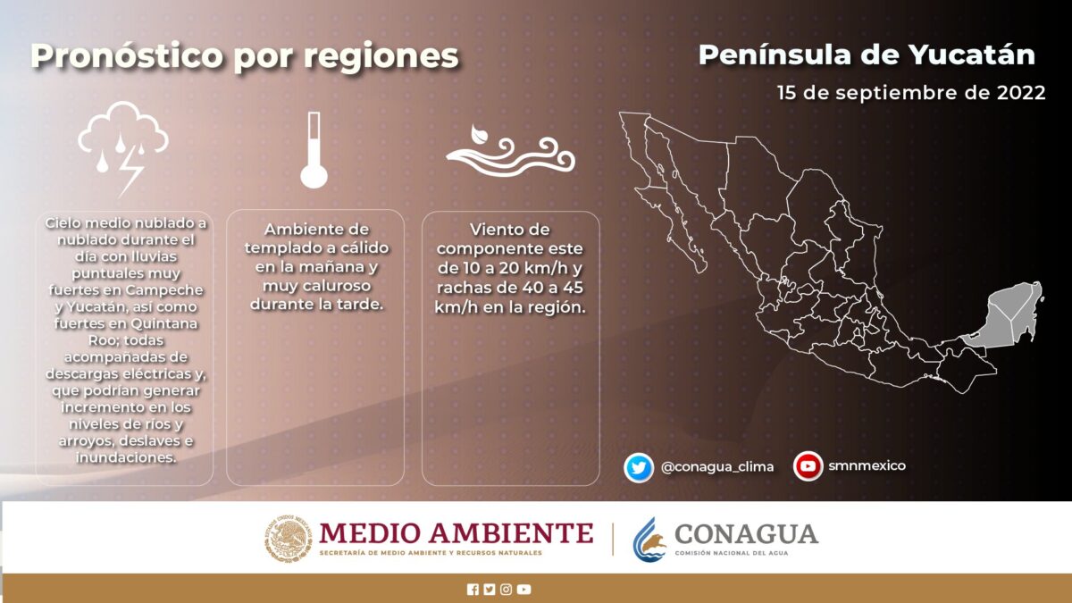 Península de Yucatán: Cielo medio nublado a nublado durante el día con lluvias puntuales muy fuertes en Campeche y Yucatán, así como fuertes en Quintana Roo; todas acompañadas de descargas eléctricas y, que podrían generar incremento en los niveles de ríos y arroyos, deslaves e inundaciones. Ambiente templado a cálido por la mañana y muy caluroso por la tarde. Viento de componente este de 10 a 20 km/h y rachas de 40 a 45 km/h en la región.
