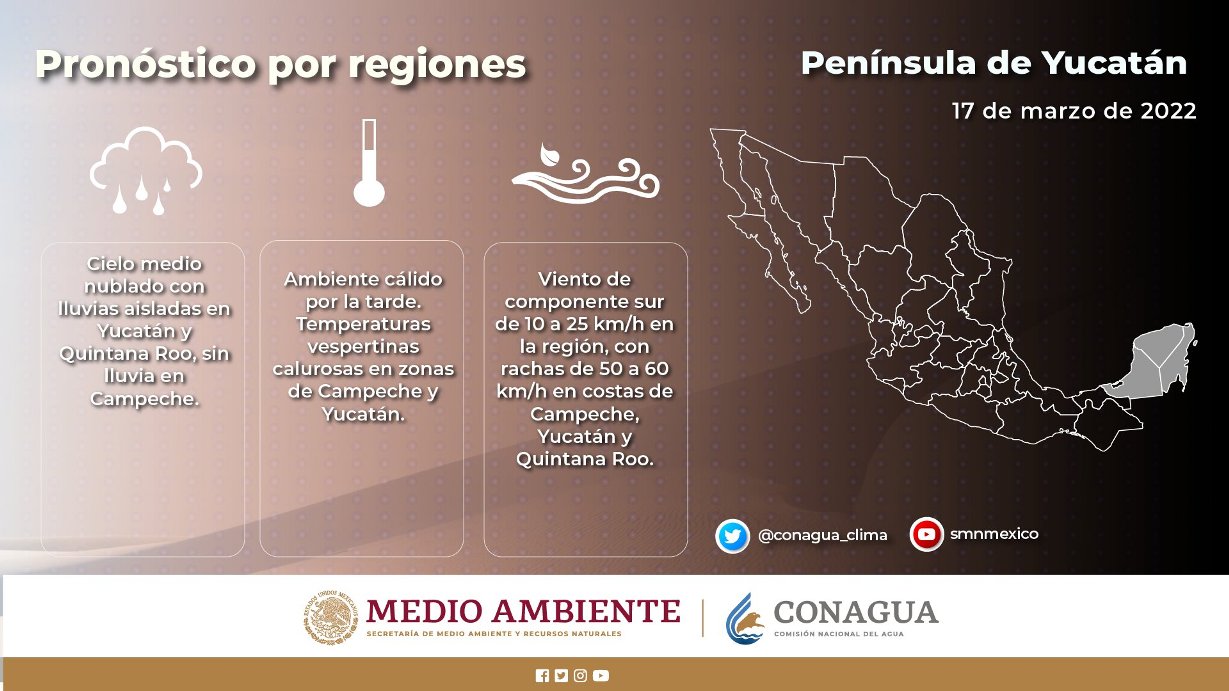 Península de Yucatán: Cielo medio nublado con lluvias aisladas en Yucatán y Quintana Roo, sin lluvia en Campeche. Ambiente cálido por la tarde. Temperaturas vespertinas calurosas en zonas de Campeche y Yucatán. Viento de componente sur de 10 a 25 km/h en la región, con rachas de 50 a 60 km/h en costas de Campeche, Yucatán y Quintana Roo.