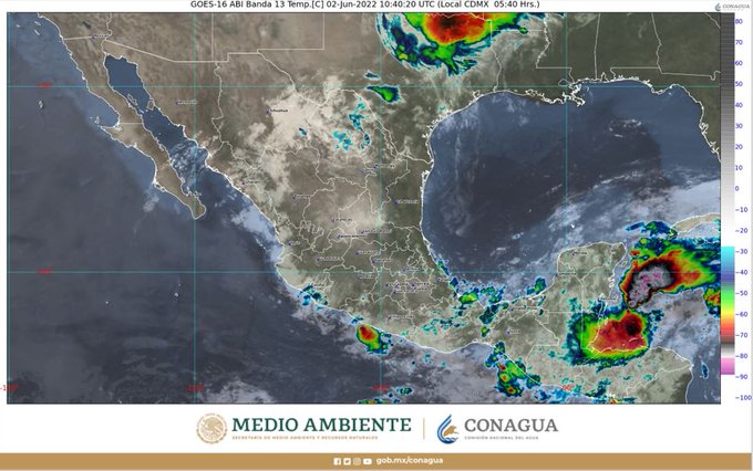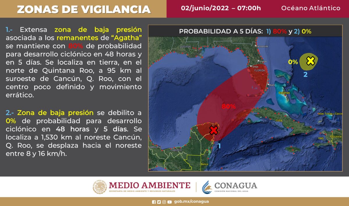 Pronóstico del clima para hoy jueves 2 de junio en Quintana Roo. Este día, la zona de baja presión con potencial ciclónico (remanentes de «Agatha») se localizará al noreste de la Península de Yucatán.