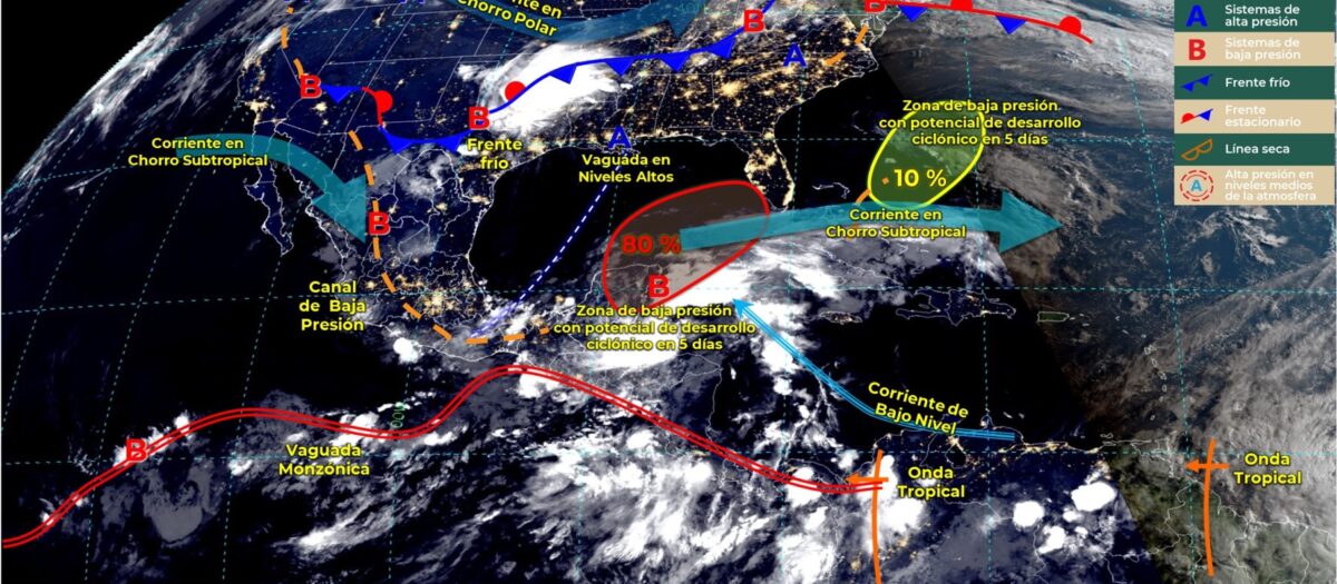 Al mismo tiempo una baja presión en el Golfo de Tehuantepec y la entrada de humedad generada por la Zona de Convergencia Intertropical (ITCZ), propiciarán lluvias de muy fuertes a puntuales intensas que podrían generar incremento en los niveles de ríos y arroyos, deslaves e inundaciones en zonas bajas de Oaxaca, Chiapas, Tabasco, Campeche, Yucatán y Quintana Roo.