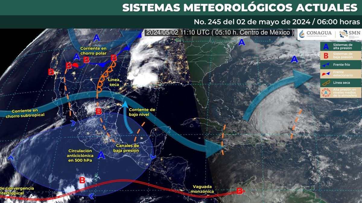 Pronóstico del clima para hoy jueves 2 de mayo de 2024 en Quintana Roo. Para este día, una línea seca sobre el norte de Coahuila, en interacción con la corriente en chorro subtropical y con inestabilidad en niveles altos de la atmósfera, producirán chubascos, descargas eléctricas y posible caída de granizo en Coahuila, Nuevo León y Tamaulipas, además de vientos con rachas de 40 a 60 km/h y posibles tolvaneras en el noroeste, norte y noreste de México.